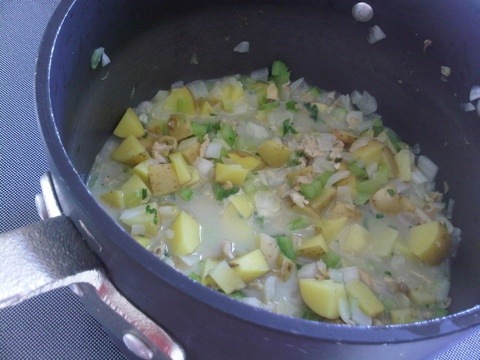 Add potato, clams, clam juice, white wine, and water and bring to boil.