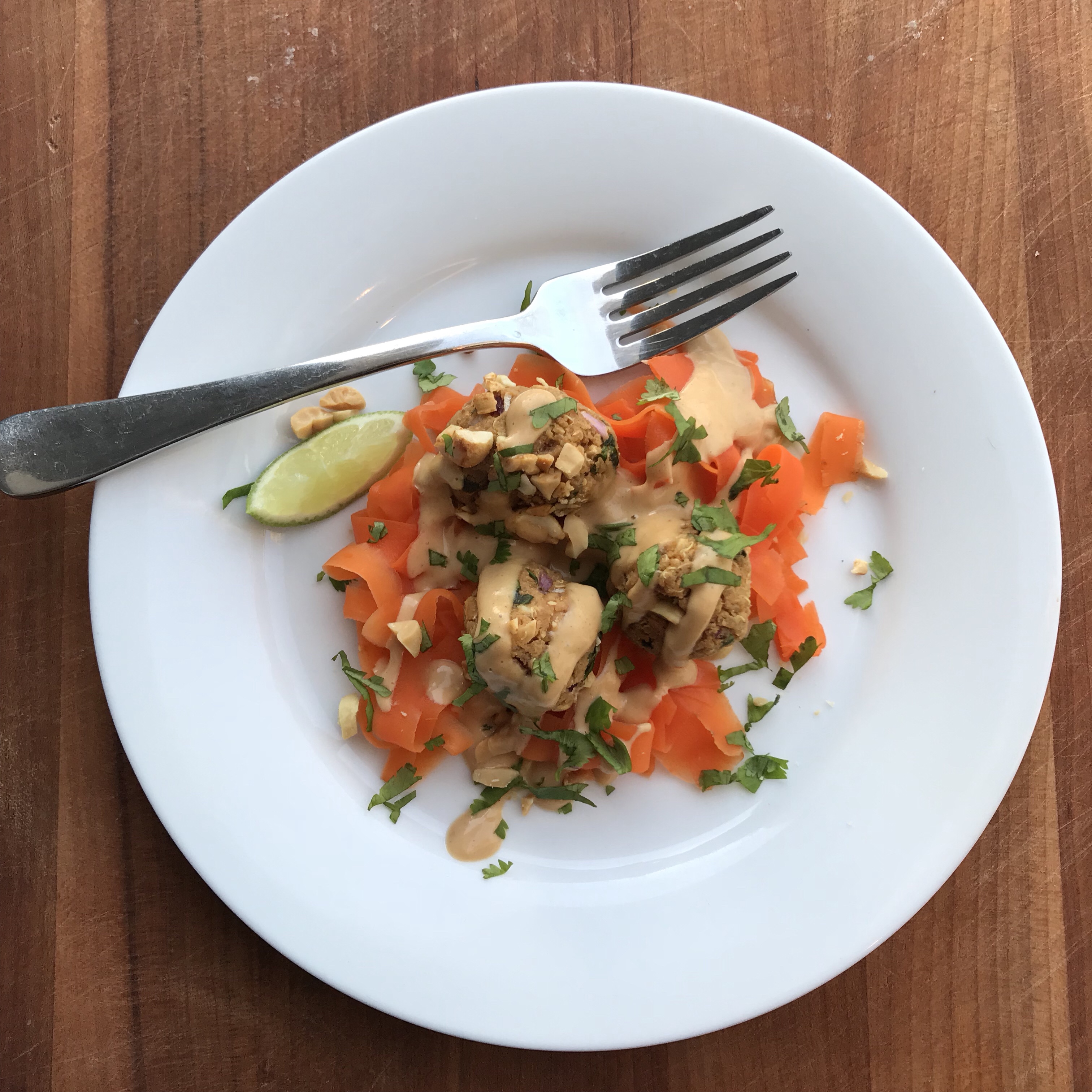 - To serve top carrots with peanut sauce, meatball and top with cilantro and chopped peanuts.